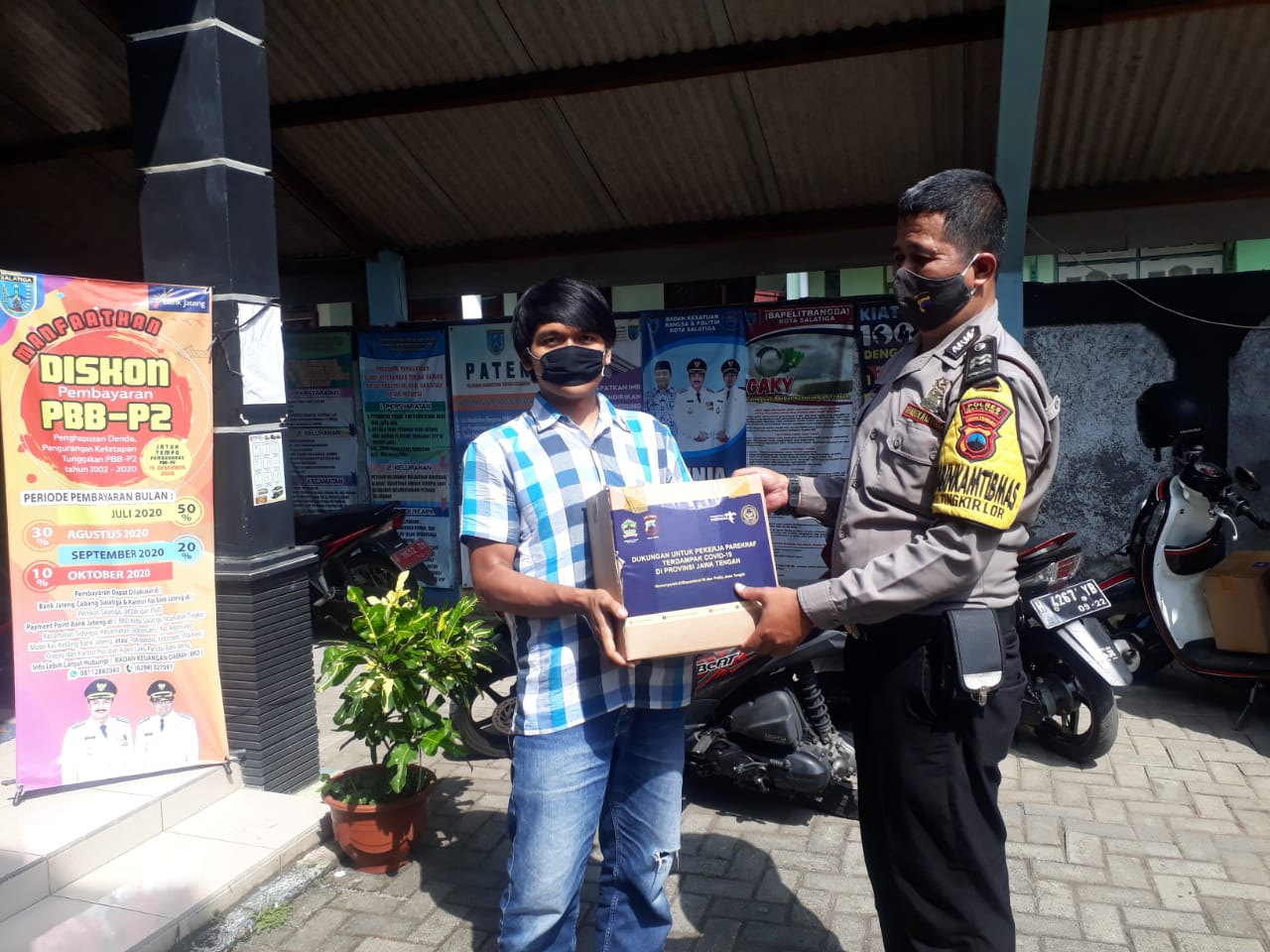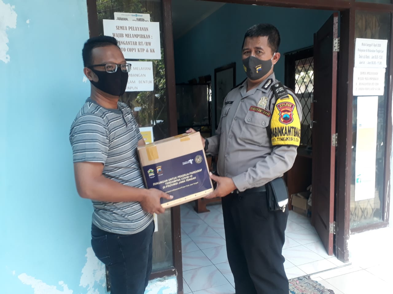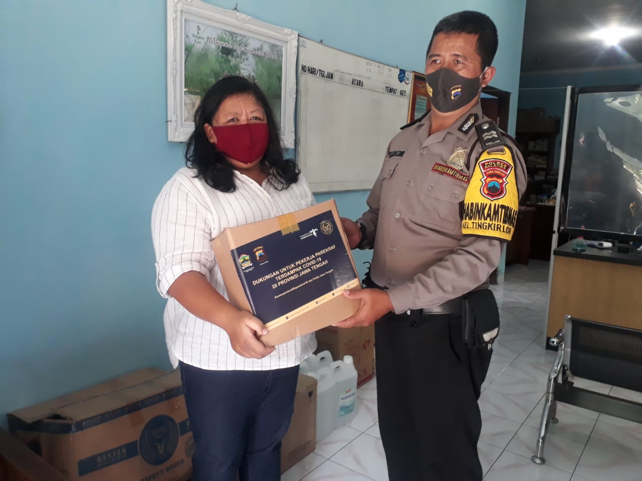 TINGKIR LOR, Selasa tanggal 14 Juli 2020 Kementerian Pariwisata dan Ekonomi Kreatif /Badan Pariwisata dan Ekonomi Kreatif bekerja sama dengan Polda Jawa Tengah menyalurkan bantuan sembako kepada pelaku dan Pekerja Pariwisata dan Ekonomi kreatif di wilayah Kelurahan Tingkir Lor yang terdampak Pandemi Covid 19. Bantuan berupa Abon 200 gr, Mi Instan 7 Buah, Kecap 600 ml, Minyak goreng 2 ltr, Tepung terigu 1 kg,Sarden 155 gr, Gula Pasir 1 kg dan Beras 5 Kg. untuk pelaku pekerja pariwisata di Kelurahan Tingkir Lor mendapatkan bantuan sebanyak 15 Paket Sembako. Penyerahan bantuan oleh Babinkamtibmas Kelurahan Tingkir Lor Bapak Pujo Wasono, SAg di dampingi oleh Lurah Tingkir Lor Bapak Asroi, SE